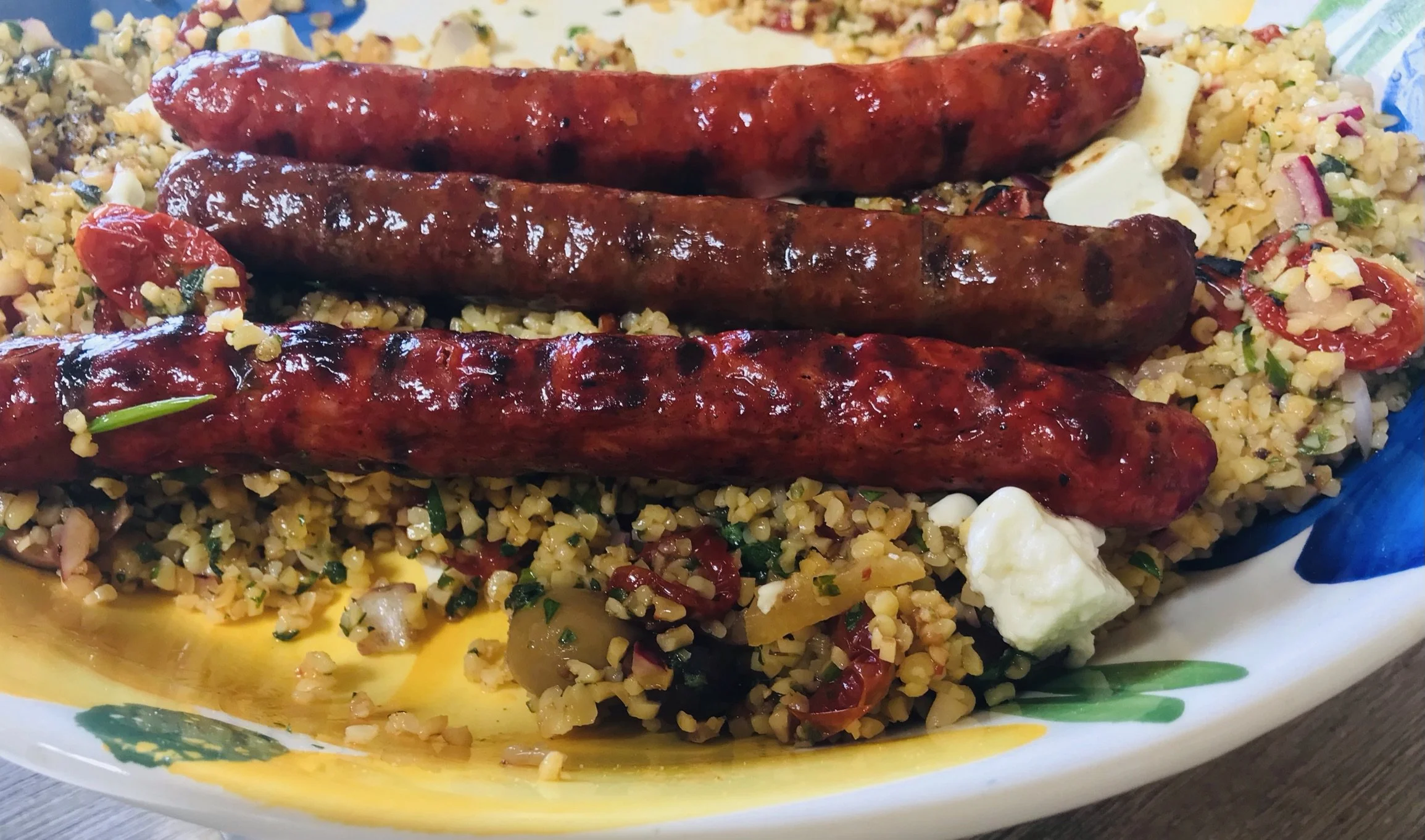 Charred Merguez sausages spiced bulgar salad with torched feta